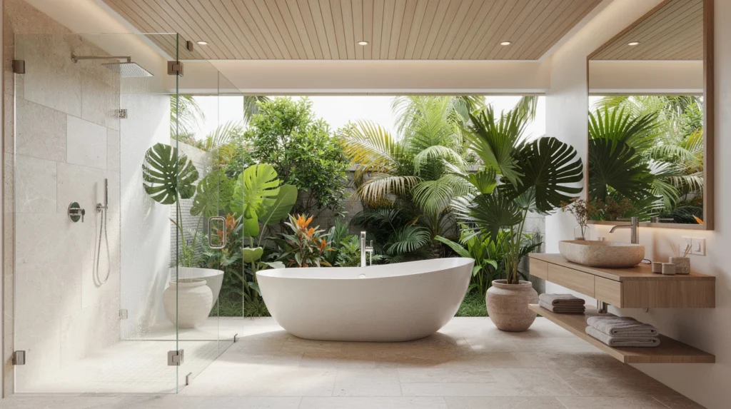 Opter pour une salle de bain tropicale répond à une double exigence : créer un espace de bien-être et intégrer la nature dans l’aménagement intérieur. En effet, ce style s’inspire des paysages de jungle luxuriante, offrant une sensation d’évasion propice à la relaxation. Par ailleurs, il présente l’avantage de valoriser des matériaux naturels et de favoriser une atmosphère saine, notamment grâce à l’utilisation de plantes et de matières non traitées. D’une part, la salle de bain tropicale s’adapte à tous les volumes, des petits espaces urbains aux grandes suites parentales. D’autre part, elle permet de jouer avec différents niveaux de personnalisation, selon vos envies et votre budget.