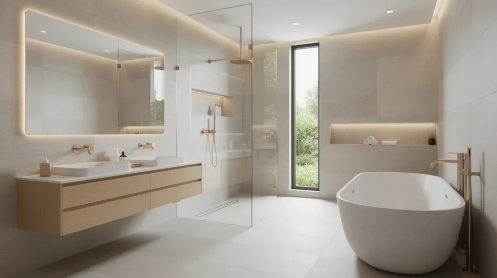 D’autre part, l’innovation occupe une place centrale. Les équipements connectés font partie intégrante des projets de rénovation. En effet, la robinetterie intelligente, les miroirs rétroéclairés avec désembuage automatique, ou encore les douches à contrôle digital optimisent le confort et la consommation énergétique. De ce fait, la salle de bains devient un espace à la pointe de l’innovation, alliant praticité et performance.